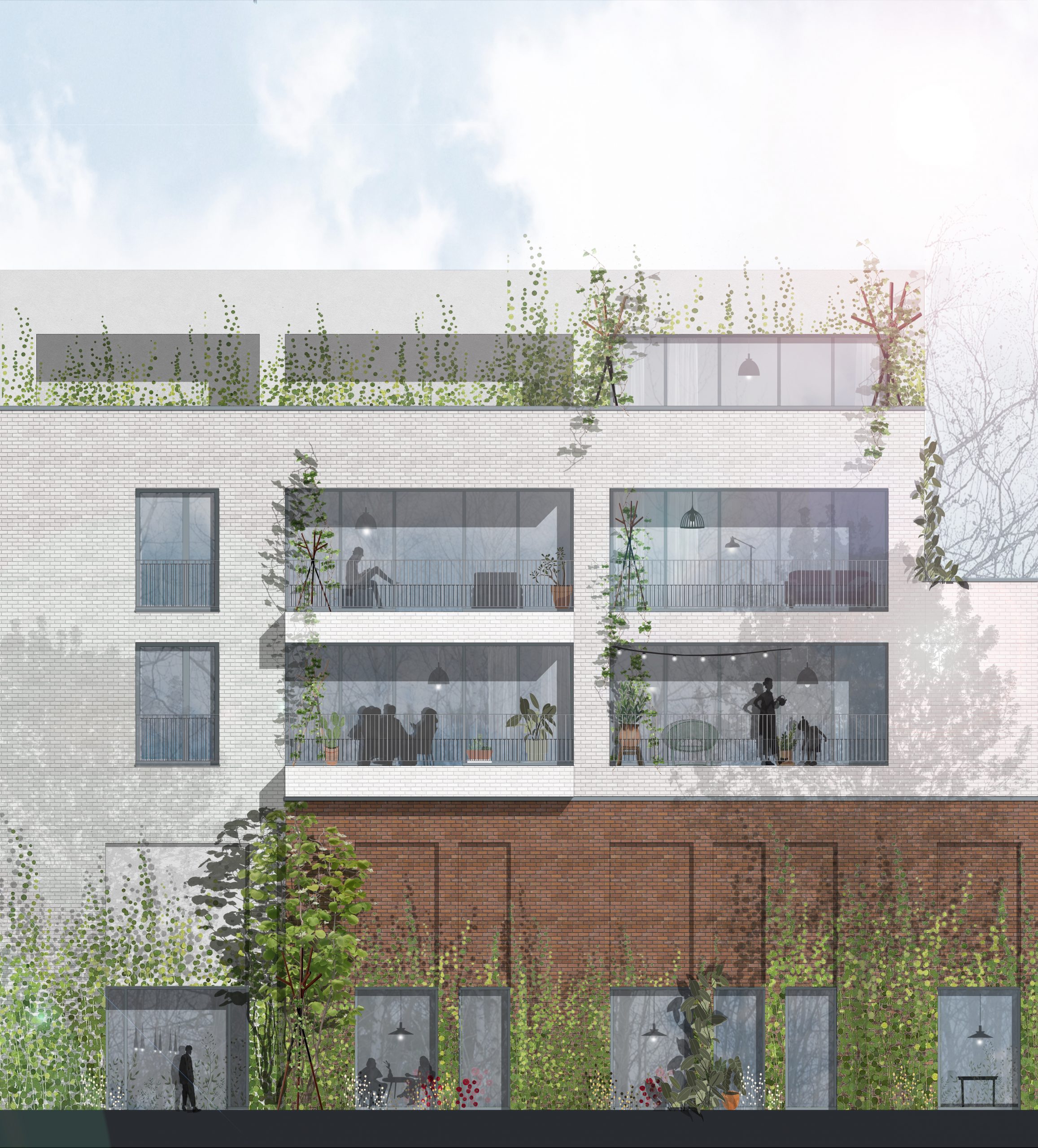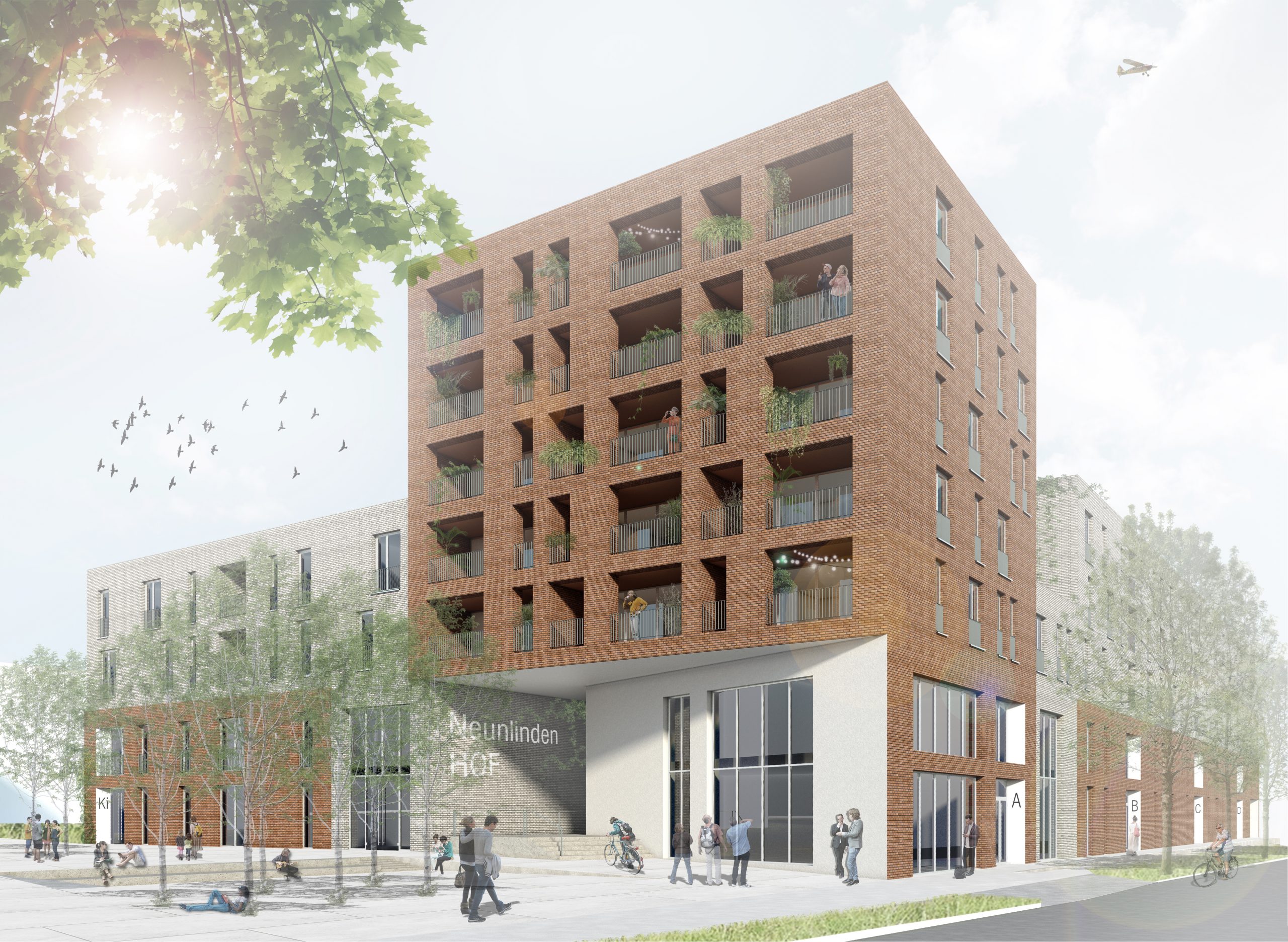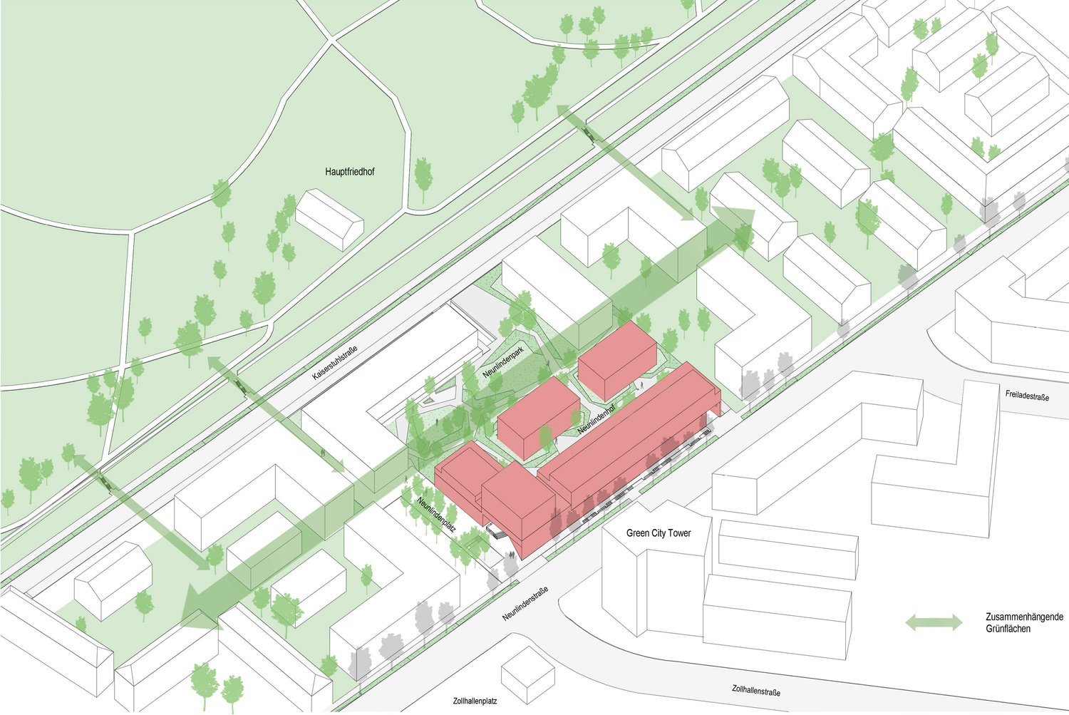 Der Entwurf gestaltet das Wettbewerbsgebiet als selbstbewusstes und vielseitiges urbanes Kleinquartier mit einem üppig grünen, partizipatorisch angelegten Innenhof. Ein L-förmiger Baukörper definiert entlang der Neunlindenstraße den öffentlichen Straßenraum und bildet gleichzeitig in Verlängerung der Zollhallenstraße einen geschützten Platz. Dieser lädt mit Café und Kita zu öffentlicher Nutzung ein und wird zum Entree der Anlage und zu ihrem lebendigen, Kontakt fördernden Zentrum. Der Neunlindenplatz ermöglicht eine fußläufige Verbindung zum Hauptfriedhof und dem nah gelegenen Grüngürtel im Freiburger Norden und wird zur Umlegung der Kanalisation genutzt. Die Bebauung öffnet sich im Inneren mit den beiden Punkthäusern in die Richtung des angrenzenden Pflegeheimes, um dieses im Gesamtkonzept eines offenen Miteinanders über eine gemeinsame Parkanlage zu integrieren.